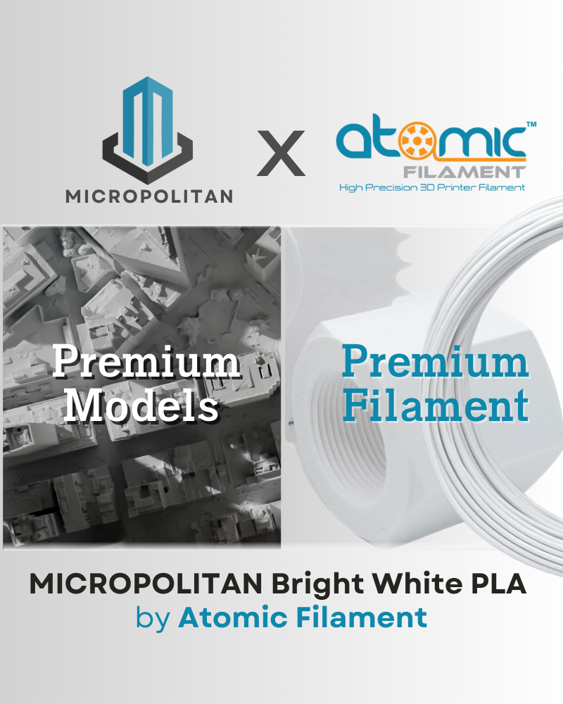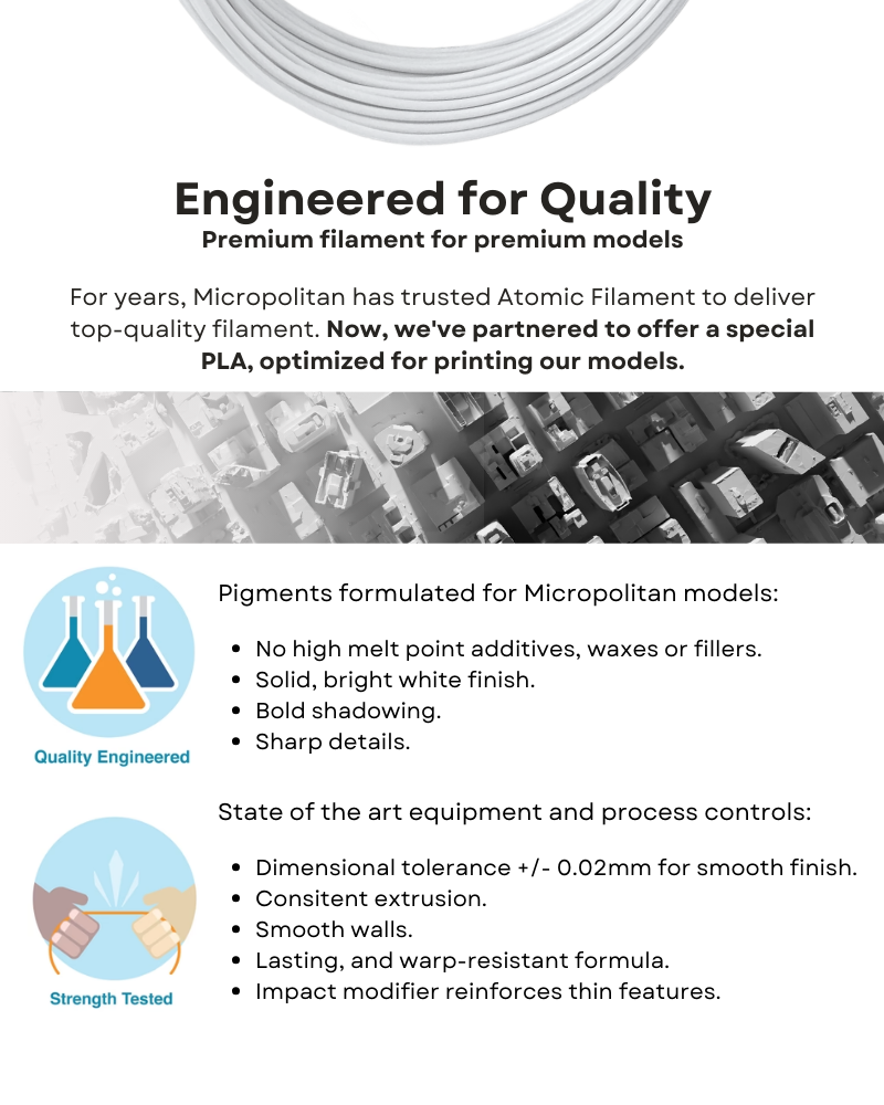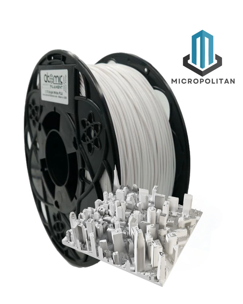 For years Micropolitan has trusted Atomic Filament to deliver top-quality filament. Now we've partnered to offer a special PLA, optimized for printing our models.